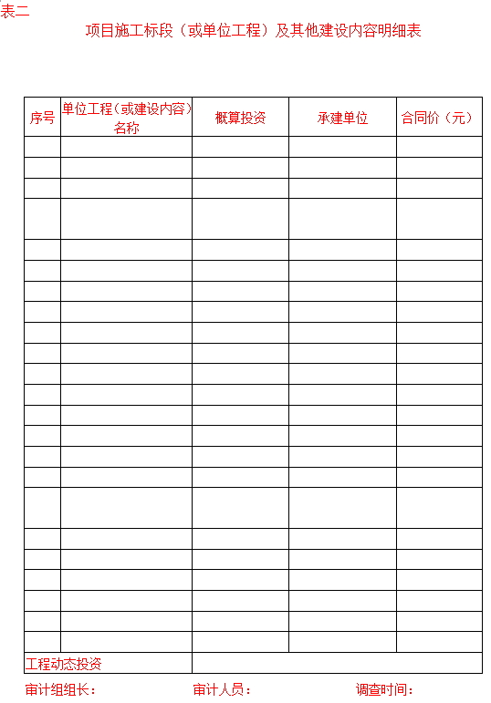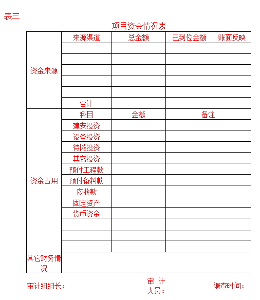 某集團(tuán)公司《基本建設(shè)項(xiàng)目跟蹤審計(jì)實(shí)施細(xì)則》中規(guī)定了審前調(diào)查的內(nèi)容,包括:基建項(xiàng)目報(bào)批情況、內(nèi)控制度建立和執(zhí)行情況、項(xiàng)目概算的批準(zhǔn)與調(diào)整情況、年度資金預(yù)算安排情況、建設(shè)資金籌措計(jì)劃與實(shí)際到位情況、基本建設(shè)程序執(zhí)行情況、其他情況;同時(shí)給出了審前調(diào)查模板。具體如下:
