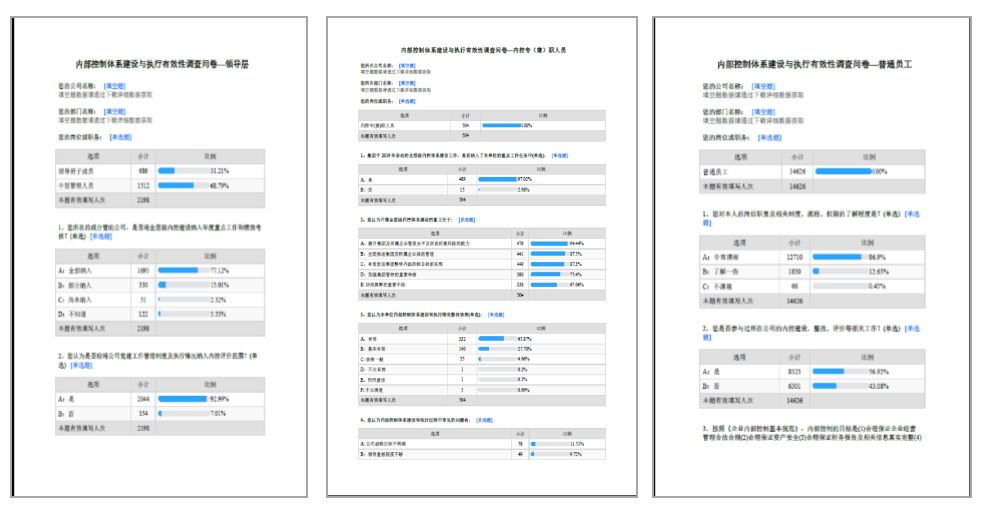 為響應(yīng)新冠疫情防控要求,集團評價工作減少了現(xiàn)場訪談環(huán)節(jié),創(chuàng)新采用“線上調(diào)查+線下分析”相結(jié)合的方式,在全層級范圍內(nèi)對集團內(nèi)控管理工作進行調(diào)查。為保證調(diào)查質(zhì)量,評價工作組采用分層級交叉驗證的問卷設(shè)計形式分別設(shè)計了領(lǐng)導(dǎo)層、內(nèi)控人員和普通員工三套《內(nèi)部控制體系建設(shè)與執(zhí)行有效性調(diào)查問卷》,并通過問卷星在線調(diào)查平臺展開線上調(diào)查。