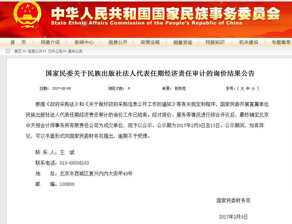 雞年初,國家民委財(cái)務(wù)司根據(jù)《政府采購法》和《關(guān)于做好政府采購信息公開工作的通知》等有關(guān)規(guī)定和程序即發(fā)出開局之年的第一個(gè)《國家民委關(guān)于民族出版社法人代表任期經(jīng)濟(jì)責(zé)任審計(jì)的詢價(jià)公告》。