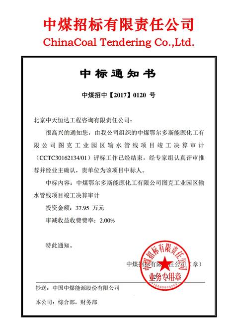 工程四部上周喜中宿州市汴北污水處理廠一期及配套管網(wǎng)工程全過程工程造價(jià)管理咨詢項(xiàng)目,緊接著又收到中煤鄂爾多斯能源化工有限公司圖克工業(yè)園區(qū)輸水管線項(xiàng)目竣 工決算審計(jì)(CCTC30162134/01)的中標(biāo)通知書,可喜可賀。