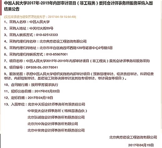 2017年3月22日,中國(guó)人民大學(xué)發(fā)出《2017年―2019年內(nèi)部審計(jì)項(xiàng)目(非工程類)委托會(huì)計(jì)師事務(wù)所服務(wù)采購(gòu)》投標(biāo)邀請(qǐng)函,本次招標(biāo)服務(wù)范圍:承擔(dān)中國(guó)人民大學(xué)組織實(shí)施的預(yù)算管理審計(jì)、經(jīng)濟(jì)責(zé)任審計(jì)、科研經(jīng)費(fèi)審計(jì)、內(nèi)部控制審計(jì)、基建竣工財(cái)務(wù)決算審計(jì)、國(guó)有資產(chǎn)管理審計(jì)及其他專項(xiàng)審計(jì)、審計(jì)調(diào)查等內(nèi)部審計(jì)項(xiàng)目。北京中天恒會(huì)計(jì)師事務(wù)所有限責(zé)任公司作為受邀請(qǐng)的單位之一,中天恒集團(tuán)高雅青董事長(zhǎng)、李三喜總經(jīng)理高度重視,并責(zé)成嚴(yán)宏副總經(jīng)理專門負(fù)責(zé)協(xié)調(diào)與指導(dǎo)標(biāo)書編制工作并組成了以張愛軍領(lǐng)導(dǎo)的財(cái)審五部為主的編標(biāo)團(tuán)隊(duì),立即投入到緊張而有序的編寫標(biāo)書過程中,首先,精準(zhǔn)研讀標(biāo)書,正確理解標(biāo)書內(nèi)容;第二,精準(zhǔn)選擇過往業(yè)績(jī),正確把握商務(wù)基分;第三,精準(zhǔn)編寫技術(shù)內(nèi)容,正確量身定做方案,此外,總體把握標(biāo)書質(zhì)量,嚴(yán)格按照要求排版,嚴(yán)謹(jǐn)文字表述,做到商務(wù)和技術(shù)兩部分一致,從而為投標(biāo)打下當(dāng)良好基礎(chǔ)。最終的成功中標(biāo)結(jié)果充分印證了由于北京中天恒會(huì)計(jì)師事務(wù)所有限責(zé)任公司領(lǐng)導(dǎo)重視、編標(biāo)質(zhì)量高,獲得了中國(guó)人民大學(xué)的好評(píng)。