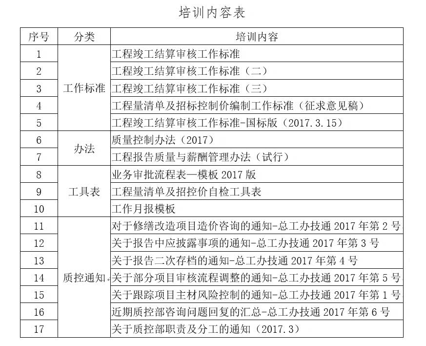 工程質(zhì)控部曹鳳從結(jié)算審核工作標準、質(zhì)控辦法、工作工具表、質(zhì)控發(fā)出的紅頭文件等幾方面進行了培訓,參加此次培訓的工程師對于疑難困惑也逐條提出,進行了全面而細致的交流。