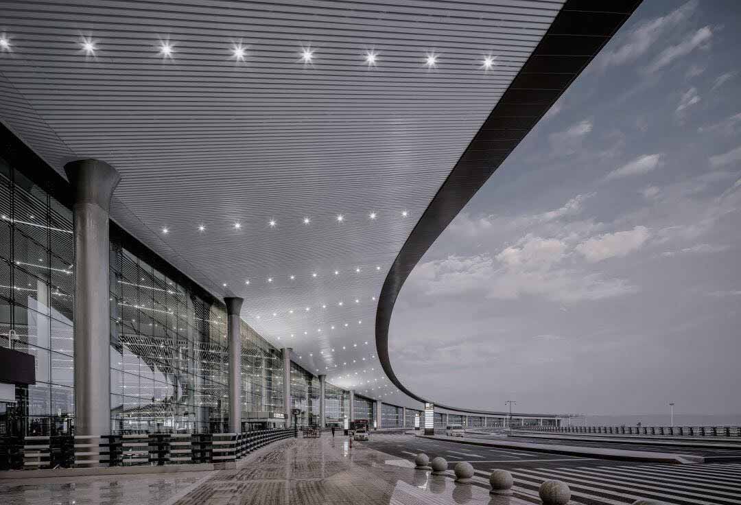武漢天河T3航站樓采用現(xiàn)代簡約、整體流暢、舒展大氣的流線造型,結(jié)合大型花園、庭院及大屋頂分散式采光天窗的運(yùn)用,塑造"銀河璀璨,鳳舞九天"的現(xiàn)代地標(biāo)形象。航站樓規(guī)模49.5萬平米,配套GTC25.5萬平米,年吞吐量3500萬人次。