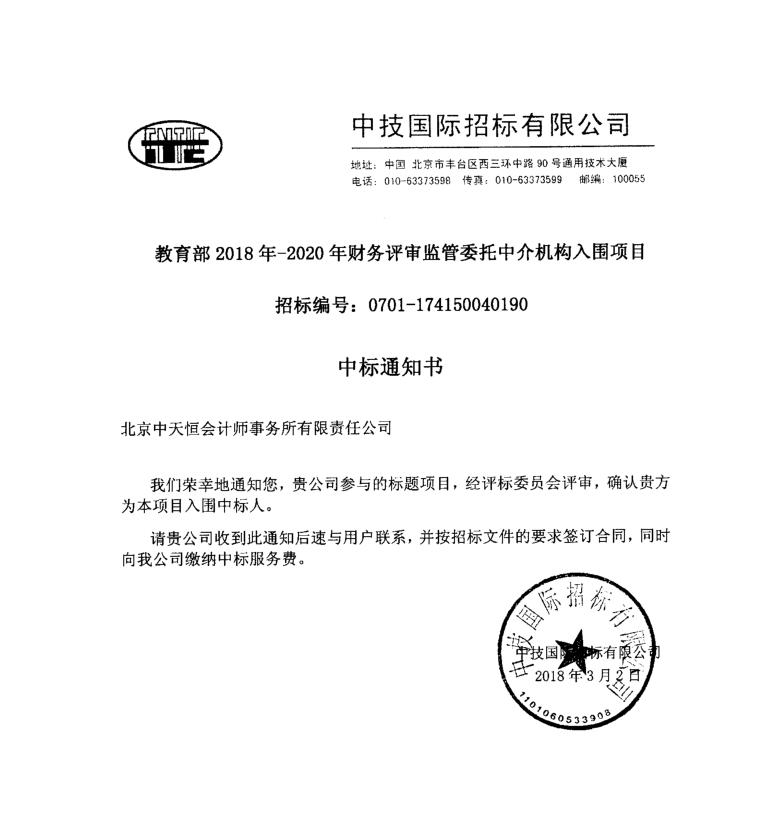 2018年2月26日我所參加了由中技國際招標有限公司組織的教育部2018年-2020年財務評審監(jiān)管委托中介機構入圍項目的投標工作。此次招標內容主要為教育部提供項目評審、績效評價、審計監(jiān)督、資產評估、財務檢查、咨詢服務等業(yè)務,預算金額1600萬元/年,服務期限3年,擇優(yōu)選擇10家單位。我所在投標過程中,憑借其完備的資質條件,通過對以往的審計服務經驗,及合理的人員配備,在55家競爭單位中脫穎而出,以第四名的成績成功入圍此項目。