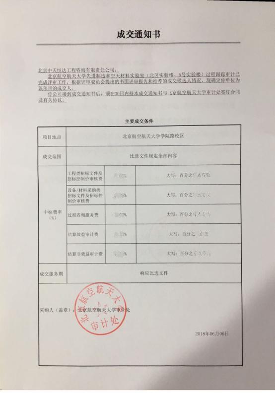 2018年6月5日我單位參加了北京航空航天大學(xué)先進(jìn)制造和空天材料實(shí)驗(yàn)樓(北區(qū)實(shí)驗(yàn)樓、5號實(shí)驗(yàn)樓)過程跟蹤審計(jì)比選和國家實(shí)驗(yàn)室大樓裝修改造等三個(gè)項(xiàng)目過程跟蹤審計(jì)比選活動。在兩個(gè)項(xiàng)目的比選中,我單位憑借其完備的資質(zhì)條件,通過對以往的審計(jì)服務(wù)經(jīng)驗(yàn),及合理的人員配備,在眾多競爭單位中脫穎而出,綜合評分排名均為第一。