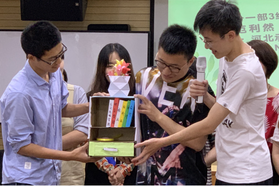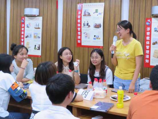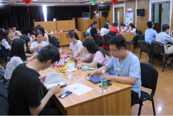 四組參加者圍成圓圈依次交叉落坐,圍成圓圈,并隨即更換成右鄰者的名字,回答問題,主持人隨機(jī)發(fā)問,當(dāng)自己該回答時(shí)卻不回答,不是自己該回答的人就要被淘汰。經(jīng)過幾輪激烈的提問與回答,“先鋒隊(duì)”獲得了活動(dòng)材料優(yōu)先選擇權(quán),其次是“甲秀天下”隊(duì)、“乙(一)帆風(fēng)順”隊(duì)和“飛虎隊(duì)”。