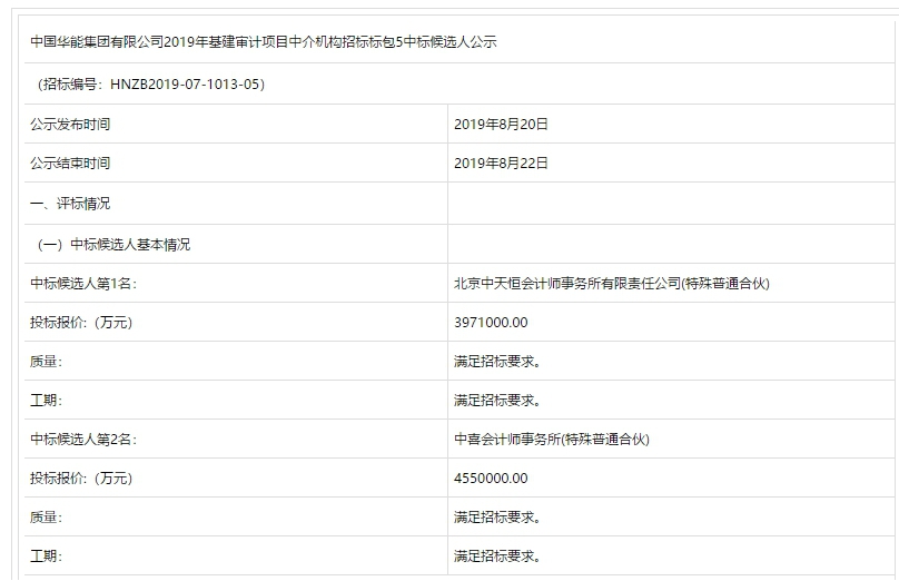 2018年7月,我們中標了中國華能集團有限公司2018年度基建審計項目中介機構(gòu)招標項目—標包2。2019年7月,再次由財審三部牽頭,工程一部配合,聯(lián)合參加“中國華能集團有限公司2019年度基建審計項目中介機構(gòu)招標項目”,此招標范圍為2019年完工、在建和擬建基建審計項目共27個,其中竣工決算審計項目21個,跟蹤審計項目6個。項目共分為5個包,在整個投標過程中,財審三部與工程一部根據(jù)各自以往的審計經(jīng)驗,拿出詳實的技術(shù)方案、合理的人員配置及最具有代表性的業(yè)績,最終在該項目份額最高的標包5中脫穎而出,以綜合排名第一的成績中標,中標金額397.10萬元。