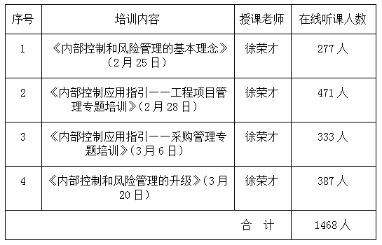 總咨詢師徐榮才利用工作閑暇,主動(dòng)設(shè)計(jì)和準(zhǔn)備課件,先后組織了四次內(nèi)部控制與風(fēng)險(xiǎn)管理的專題培訓(xùn)講座,各個(gè)業(yè)務(wù)板塊和分子公司踴躍報(bào)名,累計(jì)聽課人員近1500人。