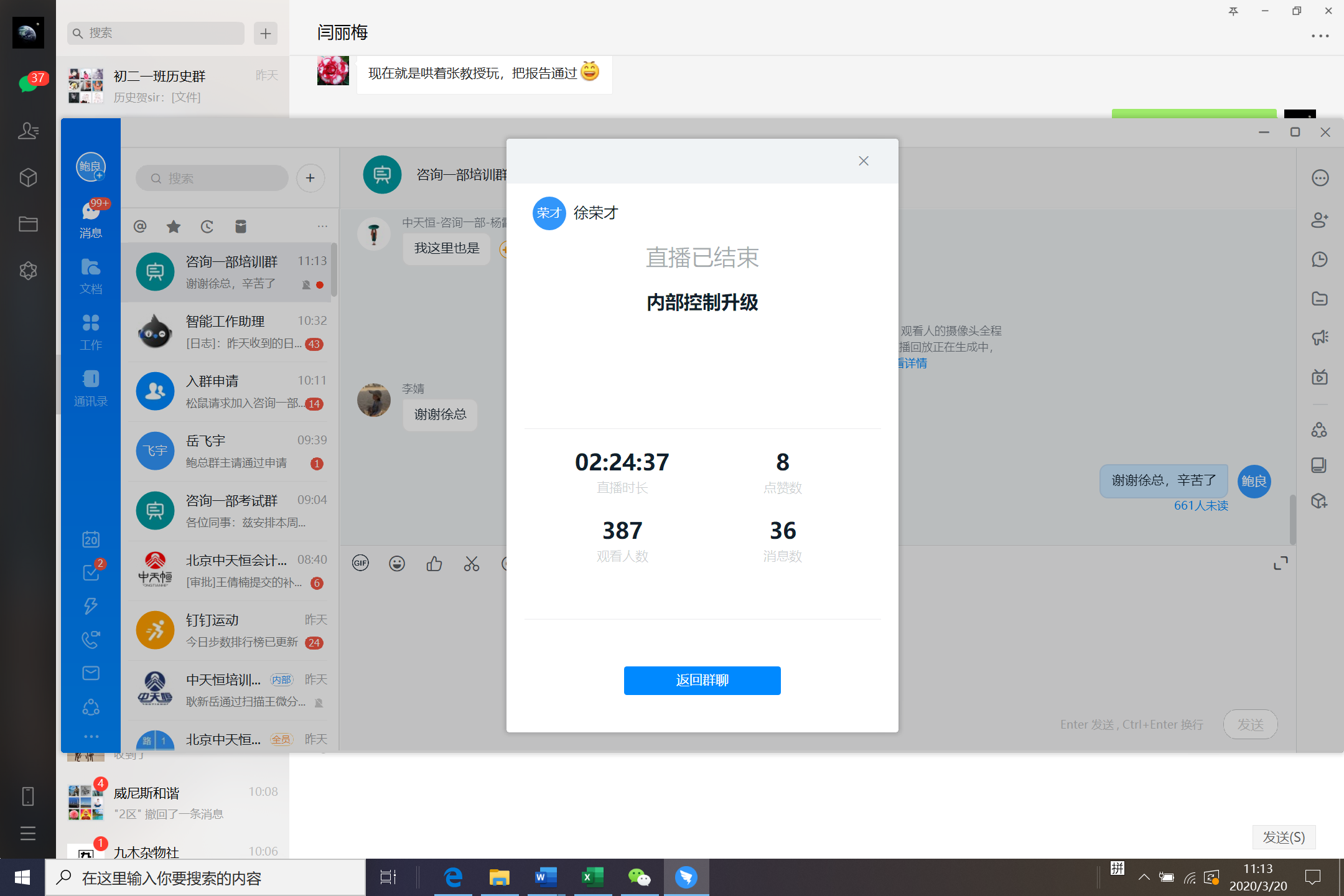 咨詢板塊——以視頻會(huì)議形式組織《三體系合一課題》的研究成果討論會(huì),讓課題研究團(tuán)隊(duì)打破空間距離限制,保持了研究工作的高效協(xié)同;與咨詢客戶每周2-3次的視頻會(huì)議,討論工作思路、交流成果反饋意見,保持了項(xiàng)目工作的順利進(jìn)行;組織新進(jìn)的咨詢團(tuán)隊(duì),開展了為期2周的業(yè)務(wù)專題培訓(xùn)和輔導(dǎo)班,不僅利用網(wǎng)上集中授課培訓(xùn),還布置家庭作業(yè)、開展答疑和作業(yè)指導(dǎo),最后還組織了入門考試,讓新進(jìn)咨詢?nèi)藛T在學(xué)習(xí)掌握業(yè)務(wù)技能的同時(shí),更近距離感受到了老師的專業(yè)和耐心,體會(huì)到中天恒大家庭的溫暖!