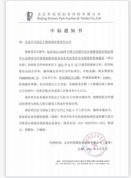近日,工程七部收獲“秋天的第一個(gè)中標(biāo)喜訊”,有幸中標(biāo)中國(guó)人民銀行會(huì)計(jì)核算系統(tǒng)全國(guó)處理中心及國(guó)家支付系統(tǒng)創(chuàng)新實(shí)驗(yàn)室業(yè)務(wù)用房項(xiàng)目全過(guò)程造價(jià)咨詢(xún)服務(wù)。