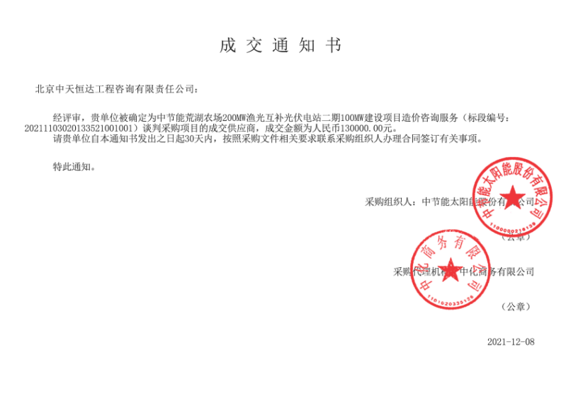 近日,由中化商務有限公司組織的“中節(jié)能蕪湖農(nóng)場200MW漁光互補光伏電站二期100MW建設項目造價咨詢服務”中有關造價咨詢服務采購項目,我們一舉中標!