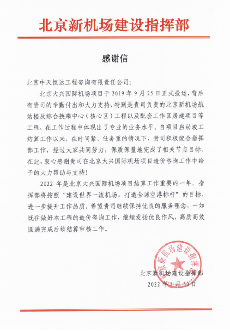 2022年1月,北京新機(jī)場(chǎng)指揮部姚總、郭總聽(tīng)取計(jì)劃合同部關(guān)于2021年北京新機(jī)場(chǎng)全場(chǎng)結(jié)算審核工作匯報(bào)會(huì),會(huì)上總結(jié)了計(jì)劃合同部領(lǐng)導(dǎo)四家造價(jià)咨詢單位進(jìn)行結(jié)算審核情況的總體工作任務(wù)布置及完成情況,高度評(píng)價(jià)了造價(jià)咨詢單位2021年全年的工作成果,并于2022年1月30日向咨詢單位頒發(fā)了感謝信!