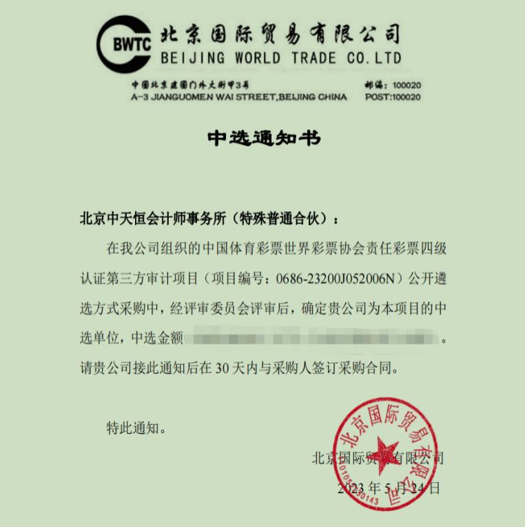 此項(xiàng)目采購需求:中國體育彩票為了持續(xù)推動責(zé)任彩票建設(shè)向世界更高水平邁進(jìn),計(jì)劃2023年向世界彩票協(xié)會遞交責(zé)任彩票四級認(rèn)證申請。世界彩票協(xié)會規(guī)定,責(zé)任彩票四級認(rèn)證的申請機(jī)構(gòu),除遞交申請書及支撐材料外,必須附有外部獨(dú)立評審機(jī)構(gòu)評審委員出具的審計(jì)報告。因此,為了保證四級認(rèn)證申請工作順利開展,需具有專業(yè)資質(zhì)的外部獨(dú)立評審機(jī)構(gòu),對中國體育彩票提交的申請書及相關(guān)材料進(jìn)行審查,并提供評審報告,滿足世界彩票協(xié)會對四級認(rèn)證申請工作的要求。上述工作需采購第三方服務(wù)機(jī)構(gòu)完成。嚴(yán)宏副總經(jīng)理與武戰(zhàn)偉副總經(jīng)理共同攜財審一部陳巖、趙方之,投標(biāo)中心朱孟飛、閆峻等組成技術(shù)專班,全身心投入編寫中國體育彩票世界彩票協(xié)會責(zé)任彩票四級認(rèn)證第三方審計(jì)項(xiàng)目投標(biāo)整體方案。2023年5月22日,中國體育彩票世界彩票協(xié)會責(zé)任彩票四級認(rèn)證第三方審計(jì)項(xiàng)目由評標(biāo)小組主持,外部專家參與的投標(biāo)會召開,經(jīng)過唱標(biāo)、述標(biāo)、評標(biāo)、審標(biāo)等環(huán)節(jié)后,報國家體育總局體育彩票管理中心批準(zhǔn),2023年5月24日發(fā)出中標(biāo)通知書,確定北京中天恒會計(jì)師事務(wù)所(特殊普通合伙)為此項(xiàng)目服務(wù)供應(yīng)商。