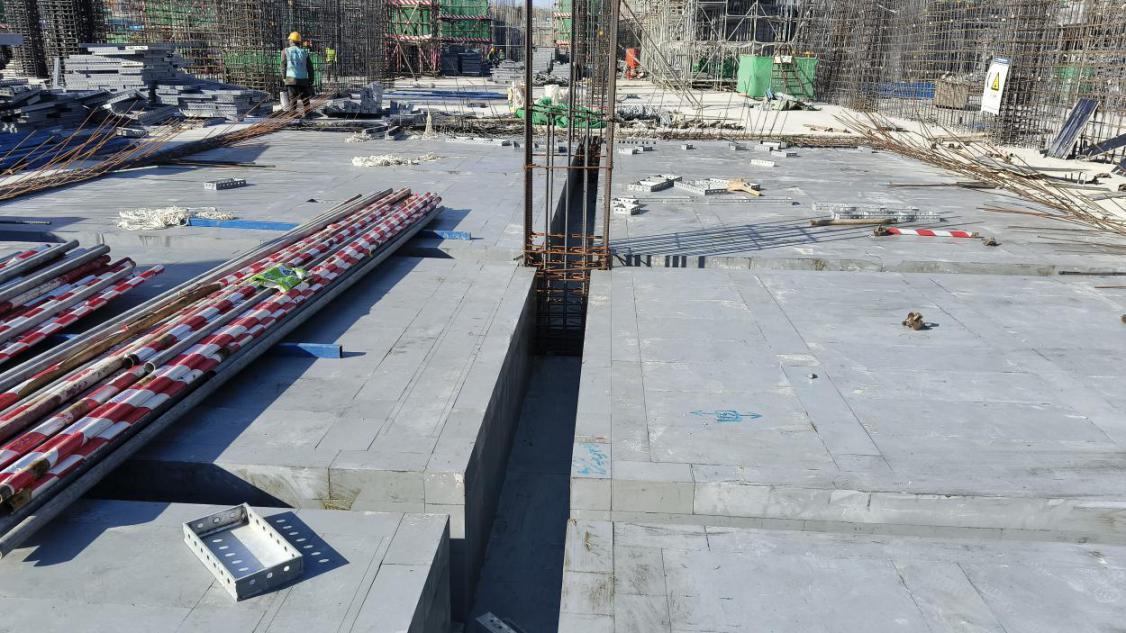 首先是6001、6003地塊宿舍樓采用不出筋開槽混凝土疊合板樓板施工工藝,該項施工技術(shù)是清華大學院士研發(fā)的專利技術(shù)。其優(yōu)勢是與傳統(tǒng)疊合板相比,不出筋混凝土疊合板樓板取消外伸鋼筋(胡子筋),安裝效率提升一倍;取消桁架鋼筋,鋼筋用量降低20%-30%;預支板厚度增加15%-30%;采用密拼式連接,不預留濕接縫,工序簡化。經(jīng)多項測試,槽口錨固21d,鋼筋可屈服,等同現(xiàn)澆受力。