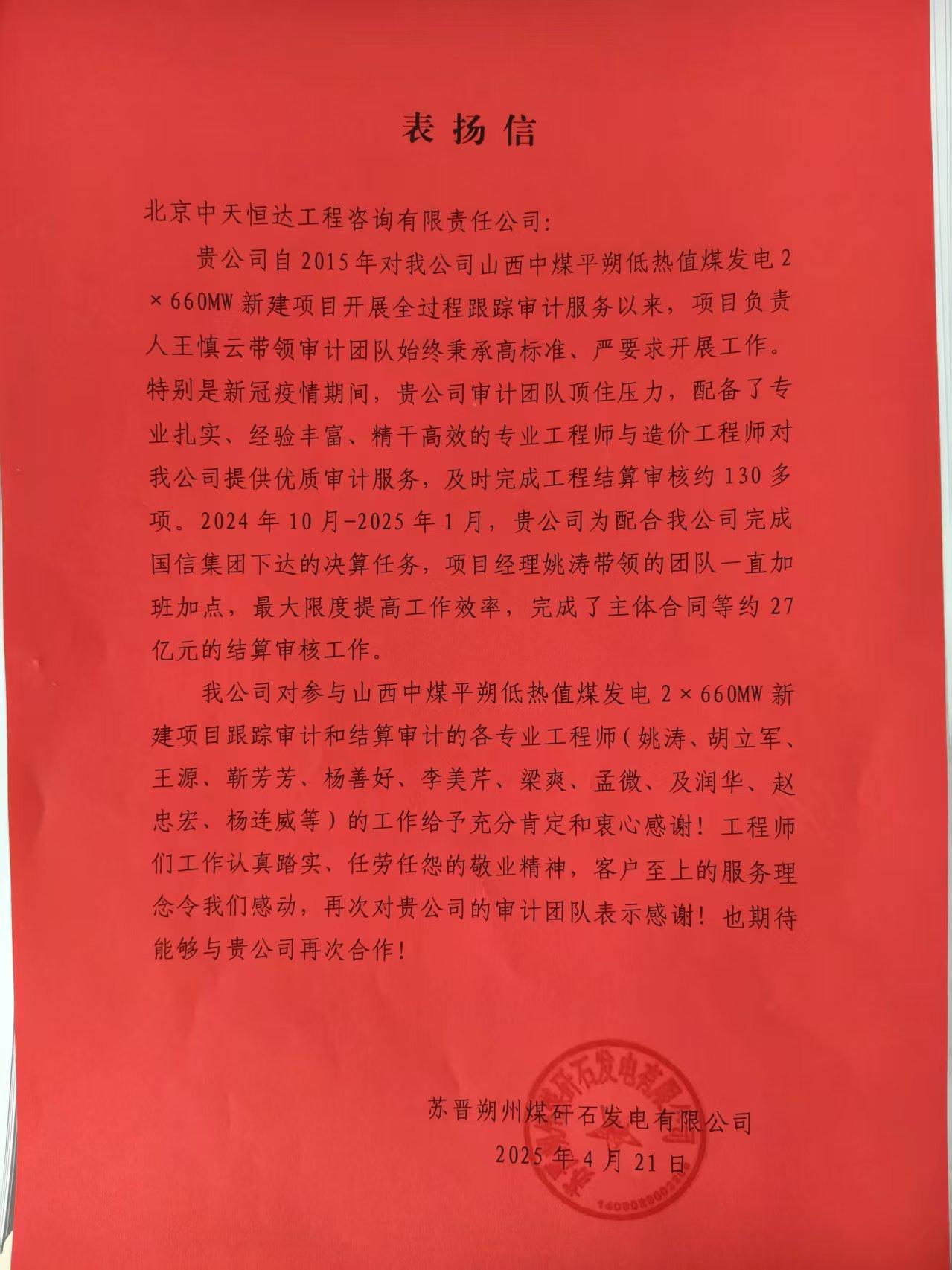 2025年4月24日上午9點(diǎn),蘇晉朔州煤矸石發(fā)電有限公司的兩劉坤總與蔚占江主任抵達(dá)中天恒(達(dá)),同項(xiàng)目負(fù)責(zé)人王慎云溝通工程竣工結(jié)算事宜。我司審核的結(jié)算已通過(guò)建設(shè)單位上級(jí)審計(jì)(南京審計(jì)),但還需要做好后續(xù)的項(xiàng)目收尾工作,并對(duì)后期財(cái)務(wù)決算也提出了要求。兩位領(lǐng)導(dǎo)專程送來(lái)了錦旗和表?yè)P(yáng)信,以表達(dá)對(duì)中天恒(達(dá))的感謝及對(duì)我們審計(jì)團(tuán)隊(duì)的高度認(rèn)可,同時(shí)也表達(dá)了未來(lái)合作的意愿。