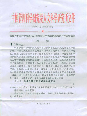 李三喜的《企業(yè)內(nèi)部控制目標(biāo)體系新定位》在中國(guó)科學(xué)發(fā)展與人文社會(huì)科學(xué)優(yōu)秀創(chuàng)新成果評(píng)選中榮獲壹等獎(jiǎng) |