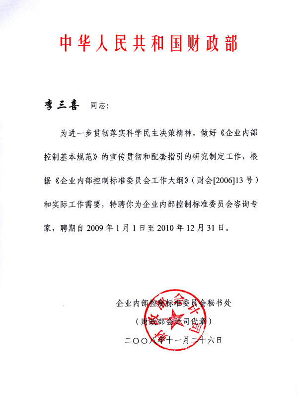 喜訊:財(cái)政部特聘李三喜為企業(yè)內(nèi)部控制標(biāo)準(zhǔn)委員會咨詢專家