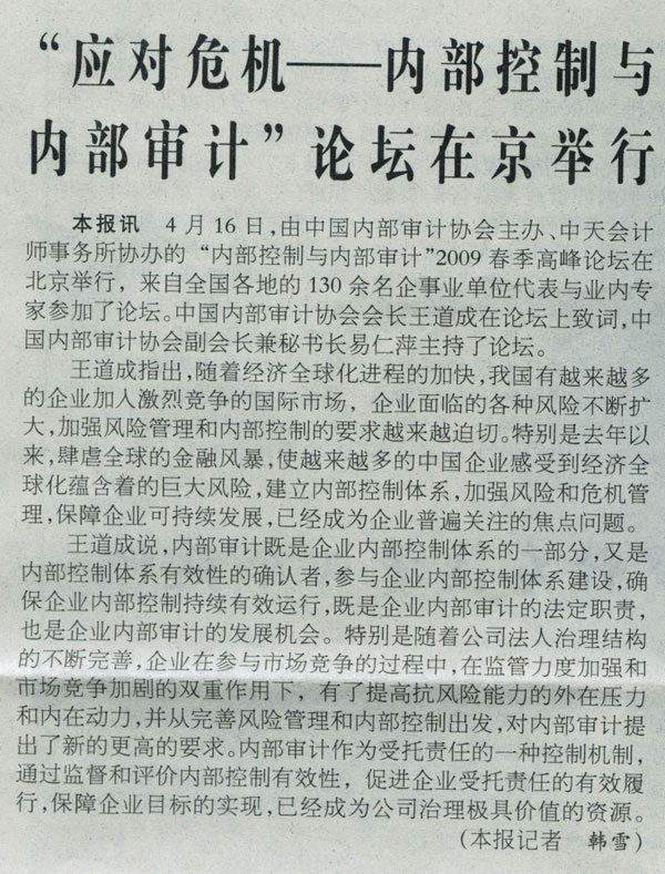 新聞報道:應(yīng)對危機(jī)——內(nèi)部控制與內(nèi)部審計(jì)”2009春季高峰論壇