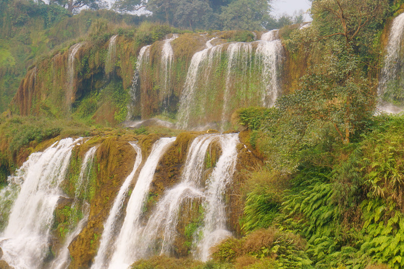 美美的合影之后,便踏上了通往通靈大峽谷的山路。這山路不像鄉(xiāng)間的小路一般坑洼,而是一排排整齊的階梯,長長地延伸入被高大樹木掩蓋起來的山澗。階梯兩旁滿是奇異高大的樹木,樹冠高高地撐開,把小路上的天空遮得嚴嚴實實。眼看小路已經(jīng)到了盡頭,但一轉彎卻又是一片新綠。剛走不久,就穿過一個布滿鐘乳石的山洞,尖尖的鐘乳石,被燈光映得忽明忽暗,仿佛有著千萬個影子在墻上跳舞。走在窄窄的通道上,旁邊的巖石不安分的突起,把小路弄得蜿蜒不絕?!鞍装l(fā)三千丈,緣愁似個長”。一段谷中之路后,終于看到了通靈大瀑布。瀑布下,水花更是四處飛濺,面前的水簾洞使得通過的女孩子們尖叫連連,自在的歡樂。