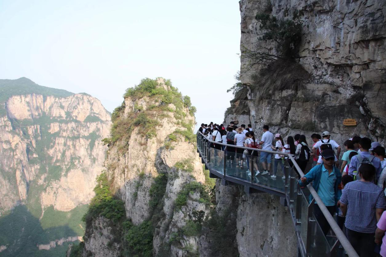 當(dāng)天中午到達(dá)修武縣稍作休息,導(dǎo)游小李公布了我們這幾天的游玩計(jì)劃,沒(méi)想到第一站就是本次游玩的“重頭戲”-鳳凰嶺玻璃棧道。初到山腳下,云霧繚繞的云臺(tái)山巍然屹立于我們眼前,群山簇立,雄偉山勢(shì)綿延不絕。乘車沿盤山路而上,一路山石壯膽,萬(wàn)花從中又不失清逸秀麗,盤山公路于峭壁間重疊直上,大巴車穿行而過(guò)的涵洞即是疊彩洞。