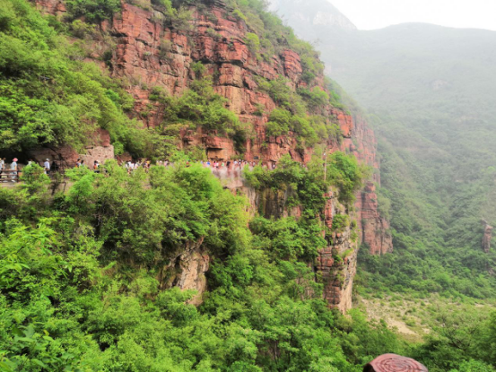 下午,我們?nèi)ネ婆_(tái)山最負(fù)盛名的景點(diǎn)-紅石峽。紅石峽為14億年前震旦紀(jì)地殼運(yùn)動(dòng)所造成的地質(zhì)遺跡,是云臺(tái)山景點(diǎn)的精華。游覽紅石峽的路線全線都是單行道,沿著一條彎曲的階梯路,一步一步地下到86米深的谷底,才能欣賞到深藏的奇景。棧道窄處,只容得兩人行走,順著棧道進(jìn)入紅色巖石陡立的峽谷半腰位置,發(fā)現(xiàn)兩側(cè)巖石觸手可及,兩岸峭壁山石秀麗,仿佛鬼斧神工雕鑿而成,明代懷慶知府徐以貞曾寫詩(shī)夸道:何年鬼斧劈層崖,鳥翼飛來(lái)一線開(kāi)。