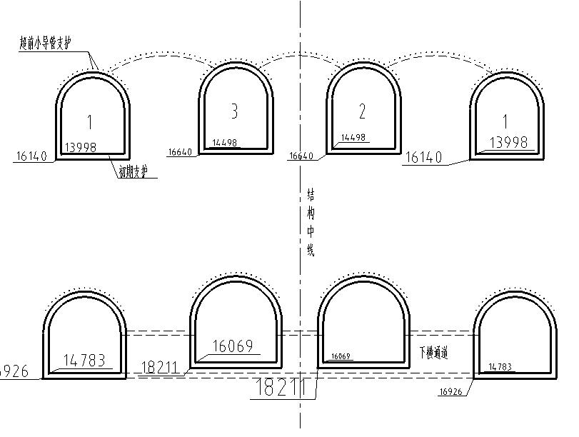 3、施工通道完成后,臺(tái)階法開(kāi)挖下導(dǎo)洞,并施工初期支護(hù)。先開(kāi)挖邊導(dǎo)洞后再開(kāi)挖中導(dǎo)洞。下導(dǎo)洞貫通后再開(kāi)挖下橫向?qū)Ф础?/div>