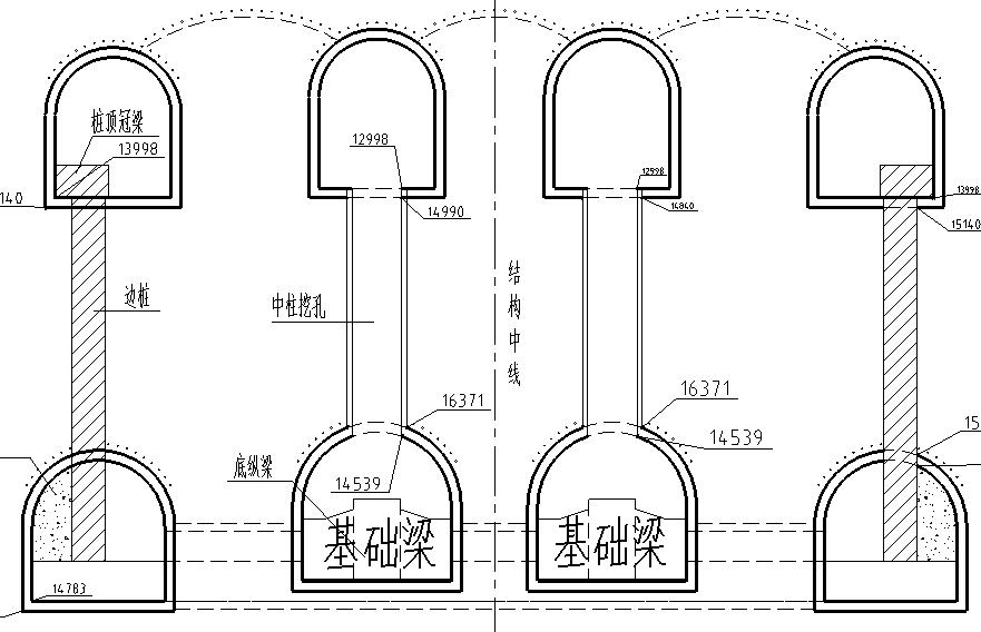 7、施工中間導(dǎo)洞鋼管混凝土柱,施工頂縱梁,邊導(dǎo)洞內(nèi)施工初支,導(dǎo)洞與初支間用混凝土回填。