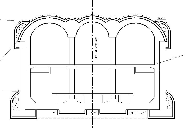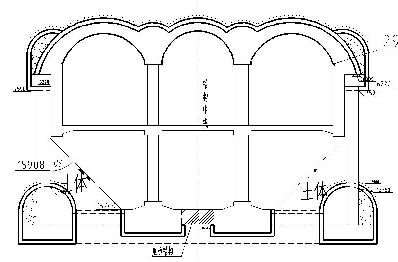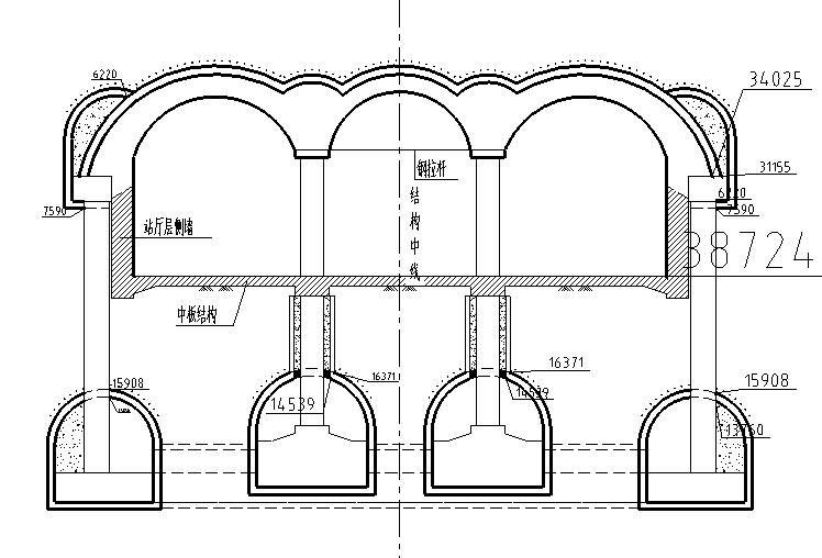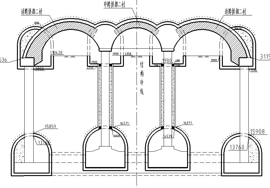 9、拱部土體貫通后,分別截?cái)鄬?dǎo)洞邊墻,鋪設(shè)防水層,后退澆筑結(jié)構(gòu)拱部二襯,設(shè)置中部鋼拉桿。中跨拱部二襯先行施工,然后再施工兩邊拱部二襯。