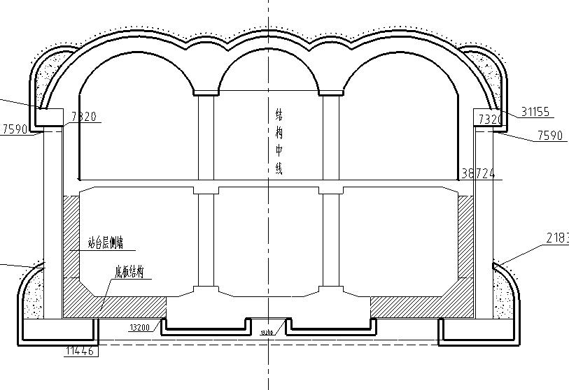 10、待拱頂混凝土達(dá)到設(shè)計(jì)強(qiáng)度后,沿車(chē)站縱向分為若干個(gè)施工段,分層向下開(kāi)挖至站臺(tái)板底標(biāo)高,分段施工地模,鋪設(shè)防水層,澆筑中板結(jié)構(gòu),施工站廳側(cè)墻混凝土。