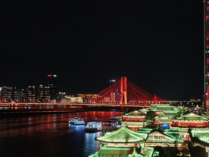 七月的南昌暑氣未消,忙完項目后我踏入滕王閣。夜色中的樓閣被燈光勾勒得愈發(fā)典雅,飛檐翹角在夜空下舒展身姿,憑欄遠眺,贛江水面游船駛過,燈光碎成滿河星子。晚風裹著水汽拂面而來,瞬間驅(qū)散了工作的疲憊。